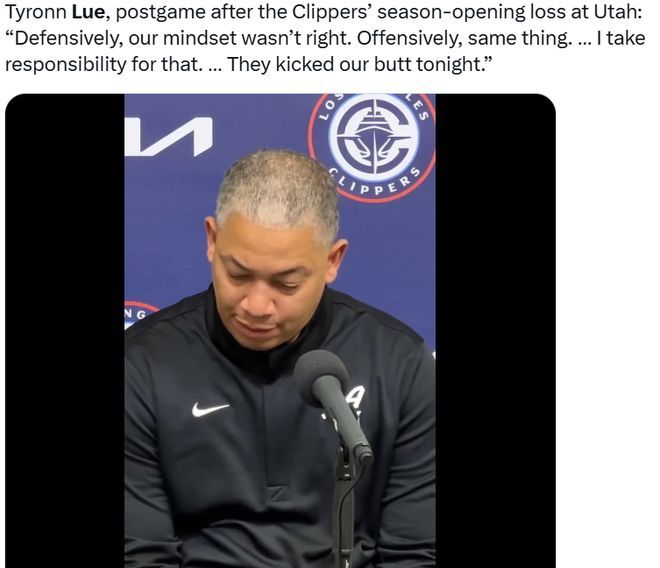 北京時(shí)間10月23日,在NBA常規(guī)賽中,洛杉磯快船在揭幕戰(zhàn)中以108-129慘敗于猶他爵士。賽后,在接受采訪的時(shí)候,泰倫-盧主動(dòng)攬責(zé)。